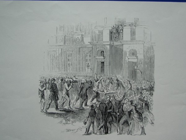 Im kleinen Schlosshof standen die Menschen dicht gedrängt. Auf mit weißen Tüchern bedeckten Brettern hielten sie dem Königspaar die durch das Militär verletzten Leichen entgegen. Sie zeigten auf die mit Immortellen und Laub geschmückten Wunden. Die Namen der Toten wurden mit einem kurzen Kommentar aufgerufen: "Vater von fünf Kindern, nieder kartätscht, als er sich schon ergeben hatte." ... " 15 Jahre alt, an meiner Seite nieder kartätscht." "Landesvater, das sind unsere Kinder! Gib uns unsere Söhne, unsere Väter, unsere Männer gib uns wieder!"